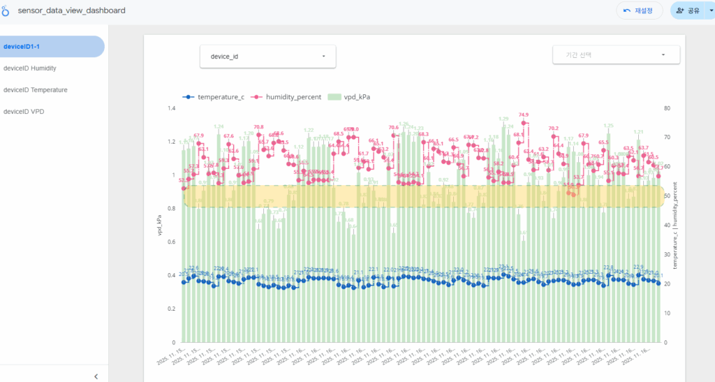 처음에는 습도 기준값을 ±5% 범위로 설정해두었는데 데이터를 확인해보니 편차가 너무 크게 나와 지금은 ±2%로 조정, 추후에는 ±1%로 더 세밀하게 조정할 예정이다. 이러한 미세 조정은 데이터 기반 의사결정 없이는 불가능하다.